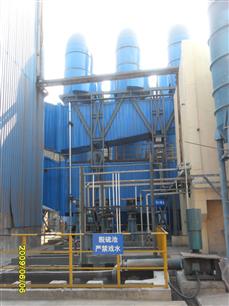 設計采用氣動旋流技術;脫硫吸收塔為鋼筋混凝土(內壁涂敷耐磨、耐腐蝕涂層)與耐酸不銹鋼復合結構,內置3級旋流板與4級布液管組。從燃燒設備中排出的含塵與二氧化硫煙氣由進風口切向進入復合式脫硫塔,首先與第一級霧化噴嘴噴射的吸收液混合;煙氣向上通過氣動旋流板,與旋流板之上布液形成的強力水膜混合、傳質,脫硫生成物與被捕集煙塵由氣、液挾裹、離心趨壁,匯聚成為水膜在設定的環形通道下泄;其上部設置2級除霧脫水旋流板與布液、沖洗結構,煙氣與吸收液在獨特的旋流板結構實現撞擊、凝聚、分離、分流,高效捕集煙氣中的二氧化硫與微細粉塵。煙氣在吸收塔頂部排出,經由連接管進入外置脫水器,在脫水器內再次完成高效氣、水分離。凈化煙氣引入煙囪排放。